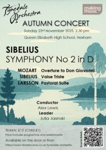 Tynedale Orchestra are playing a concert in the main QEHS school hall on Sunday 23rd November at 2.30 pm.The performance starts ...