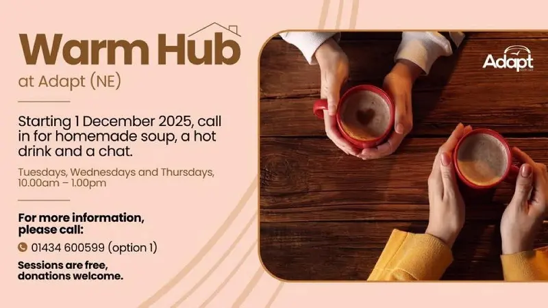 Adapt NE are opening a new Warm Hub at their site on Burn Lane in Hexham in December to offer a warm welcome to anyone who would like a hot drink or a snack, in a friendly and supportive environment. Information and signposting to support services will be on offer, and they hope to offer activities too.