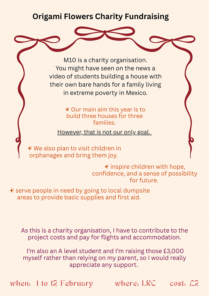 Fundraising – Origami Flowers27 January 2026News Help support sixth form student Angelina.#Respect #Engage #Aspire
