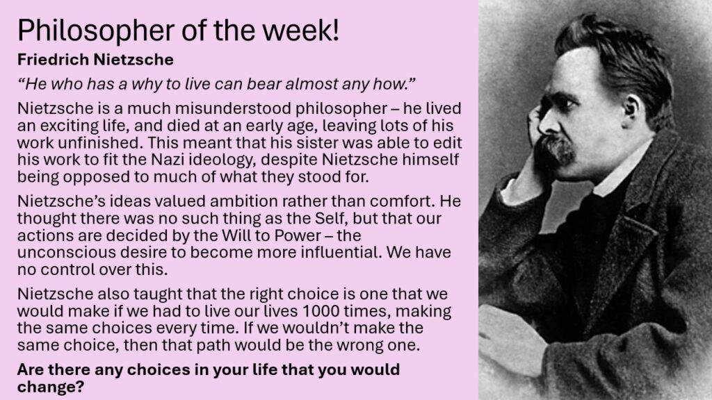 Philosopher of the week!3 February 2026News Philosopher of the week!Friedrich NietzscheRespect. Engage. Aspire.
